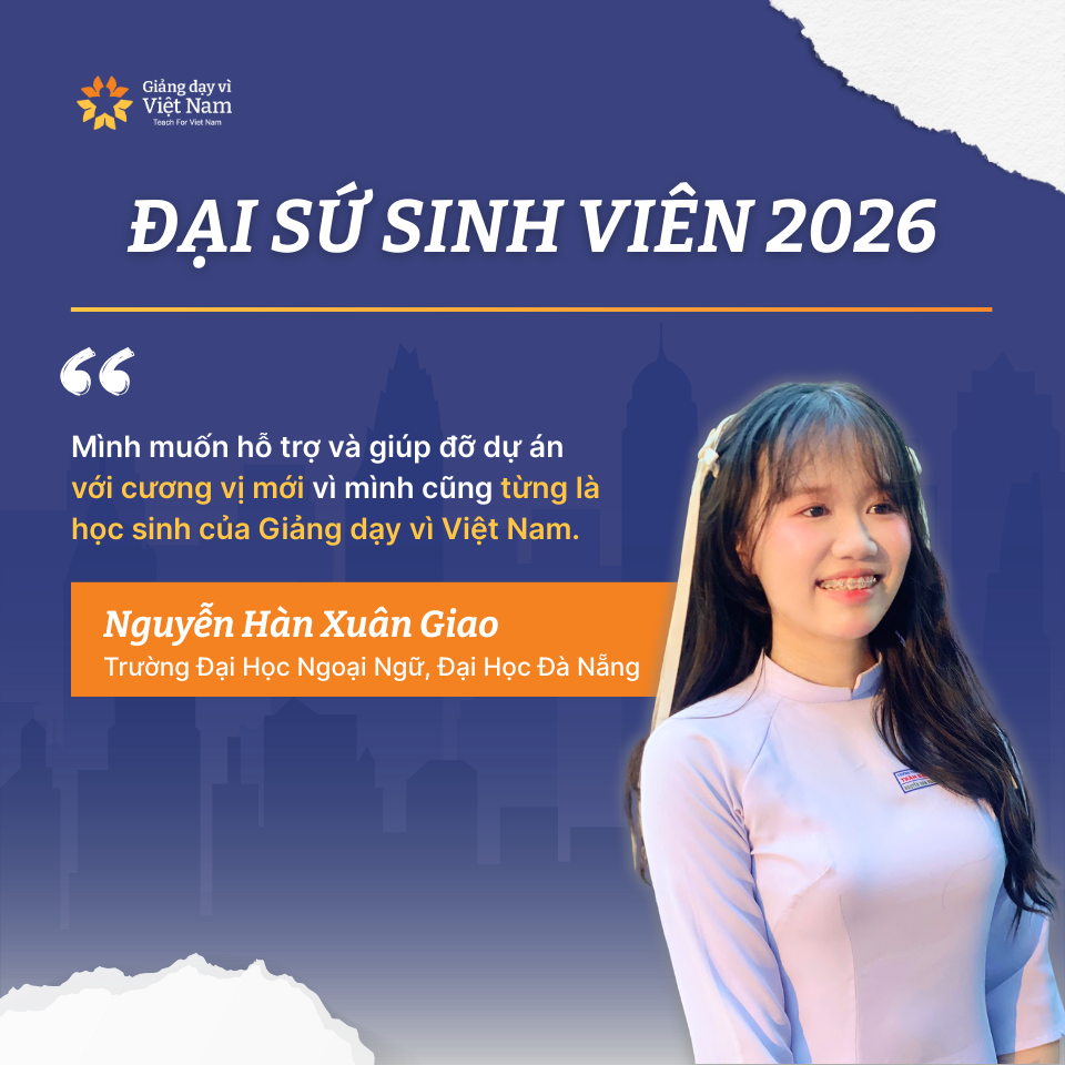 Giảng dạy vì Việt Nam xin hân hoan chào đón những thành viên mới nhất đã chính thức gia nhập đại gia đình: Đội ngũ Đại sứ Sinh viên 2026. Vượt qua các vòng tuyển chọn, 14 mảnh ghép tài năng đã tìm thấy nhau tại đây, cùng chia sẻ một niềm tin bền bỉ về hành trình mang đến cơ hội học tập chất lượng cho mọi trẻ em Việt Nam.