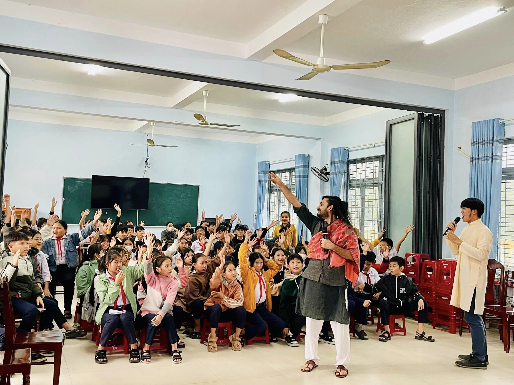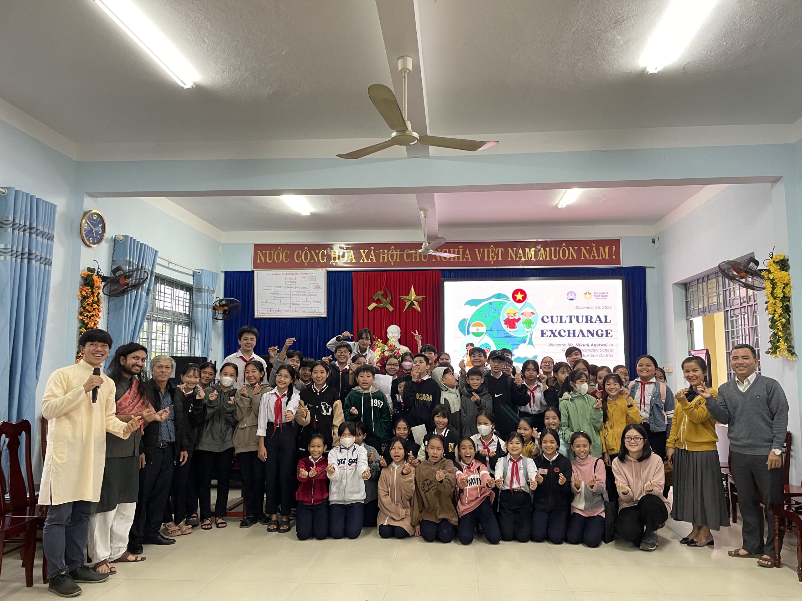 On the afternoon of December 26, 2023, in accordance with the 2023-2024 Youth Union and Children’s Movement program of the Quế Sơn District Council of Ho Chi Minh Young Pioneers’ Organization (HYPO), Inter-Chapter of HYPO of the Quế An Secondary School collaborated with Teach For Viet Nam teachers to organize an activity to enhance foreign language skills for local children under the theme “Vietnamese Children – Reaching out to the World”. 🌊✈️