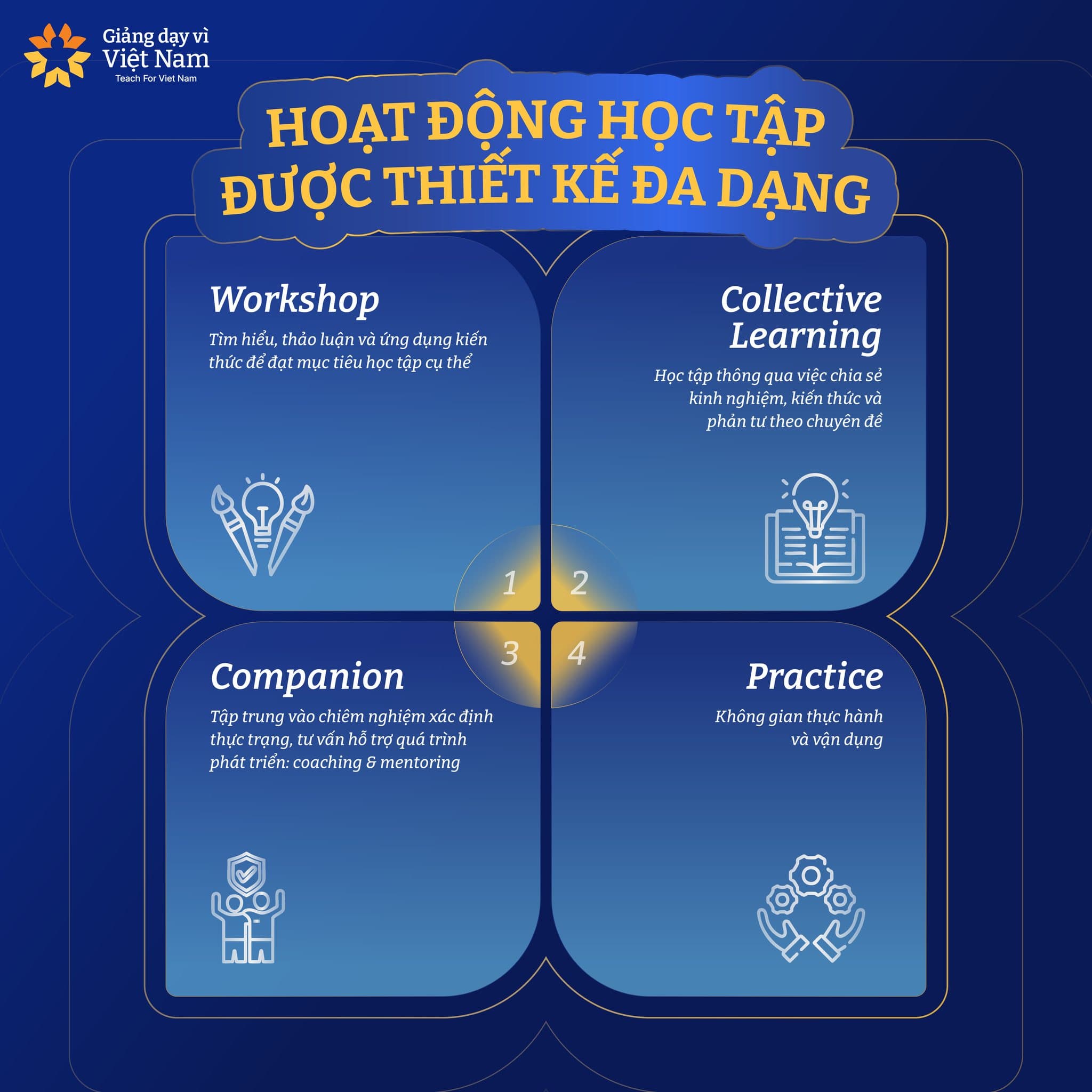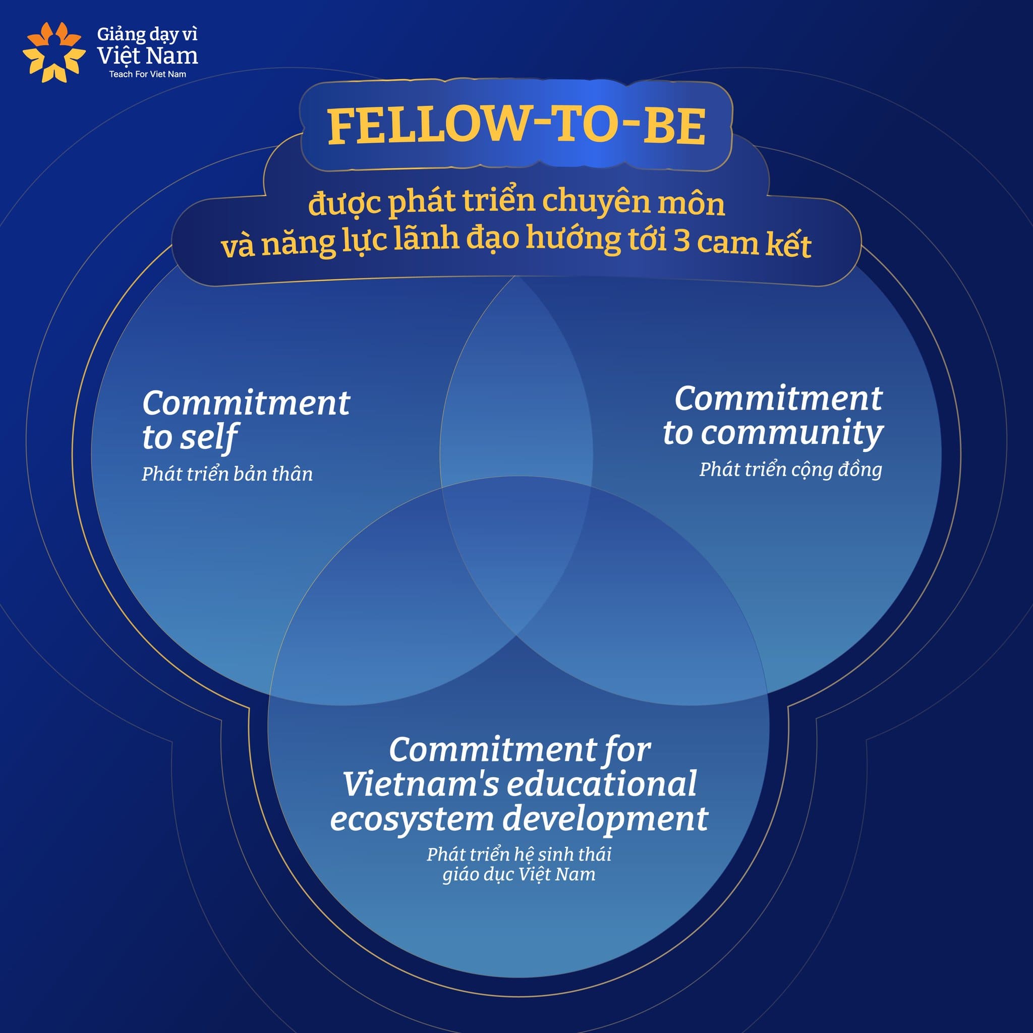 Đây là không gian nơi các Fellow-to-be tìm hiểu văn hoá tổ chức, phát triển năng lực giảng dạy, năng lực lãnh đạo và đồng thời hình thành tư duy phát triển cộng đồng – nền tảng cốt lõi trong hành trình trở thành Nhà giáo dục tiên phong.